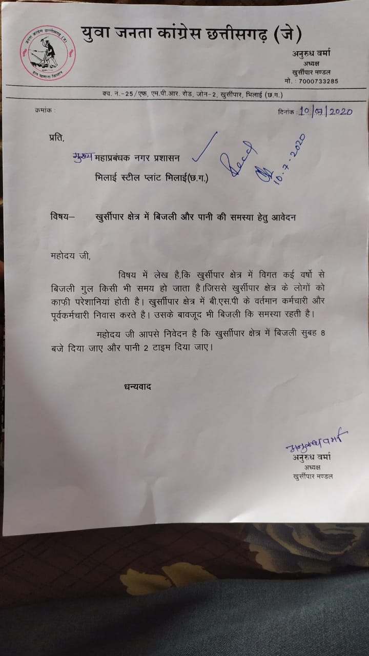 10/07/2020- लंबे समय से खुर्सीपर क्षेत्र में बिजली और पानी की समस्या को लेकर वहां के लोगों ने काफी दिक्कतों का सामना है। आज भी करना पड़ रहा है । उसी के तहत आज युवा जनता कांग्रेस छत्तीसगढ़ ( जे ) खुर्सीपार मण्डल ने बीएसपी मुख्य महाप्रबंधक नगर प्रशासन को ज्ञापन सौंपा। जनता कांग्रेस छत्तीसगढ़ ( जे ) भिलाई जिला अध्यक्ष जहीर खान के निर्देश पे युवा जनता कांग्रेस छत्तीसगढ़ ( जे ) खुर्सीपार मण्डल अध्यक्ष अनुरूध वर्मा के नेतृत्व में आज बीएसपी महाप्रबंधक को खुर्सीपार क्षेत्र में बिजली और पानी की समस्या लेकर ज्ञापन गया। युवा अध्यक्ष अनुरूध वर्मा ने प्रबंधन से चर्चा करते हुए कहा कि विगत कई वर्षों से खुर्सीपार पर क्षेत्र में बिजली और पानी की समस्या से उबर नहीं पाया हैं, आए दिन बिजली किसी भी समय गुल हो जाती हैं। खुर्सीपार क्षेत्र के लोगों को काफी समस्या सामना करना पड़ता हैं। खुर्सीपार क्षेत्र में बीएसपी के कार्यरत कर्मचारी और पूर्व कर्मचारी निवास करते हैं, और सेवायें देते है। उसके बावजूद भी बिजली की समस्या रहती हैं। युवा जनता कांग्रेस छत्तीसगढ़ ( जे ) मण्डल अध्यक्ष अनुरूध वर्मा ने कहां की बिजली सुबह 8 बजे देने और पानी 2 टाइम देने की माँग बीएसपी महाप्रबंधक और बीएसपी महाप्रबंधक ने आश्वासन दिया हैं, की जल्द से जल्द खुर्सीपार क्षेत्र में बिजली सुबह 8 बजे और पानी 2 टाइम दिया जायेगा। ज्ञापन सौपने वाले में मनोज, टिकेश जोशी, विक्की, सूरज उपस्थित थे।