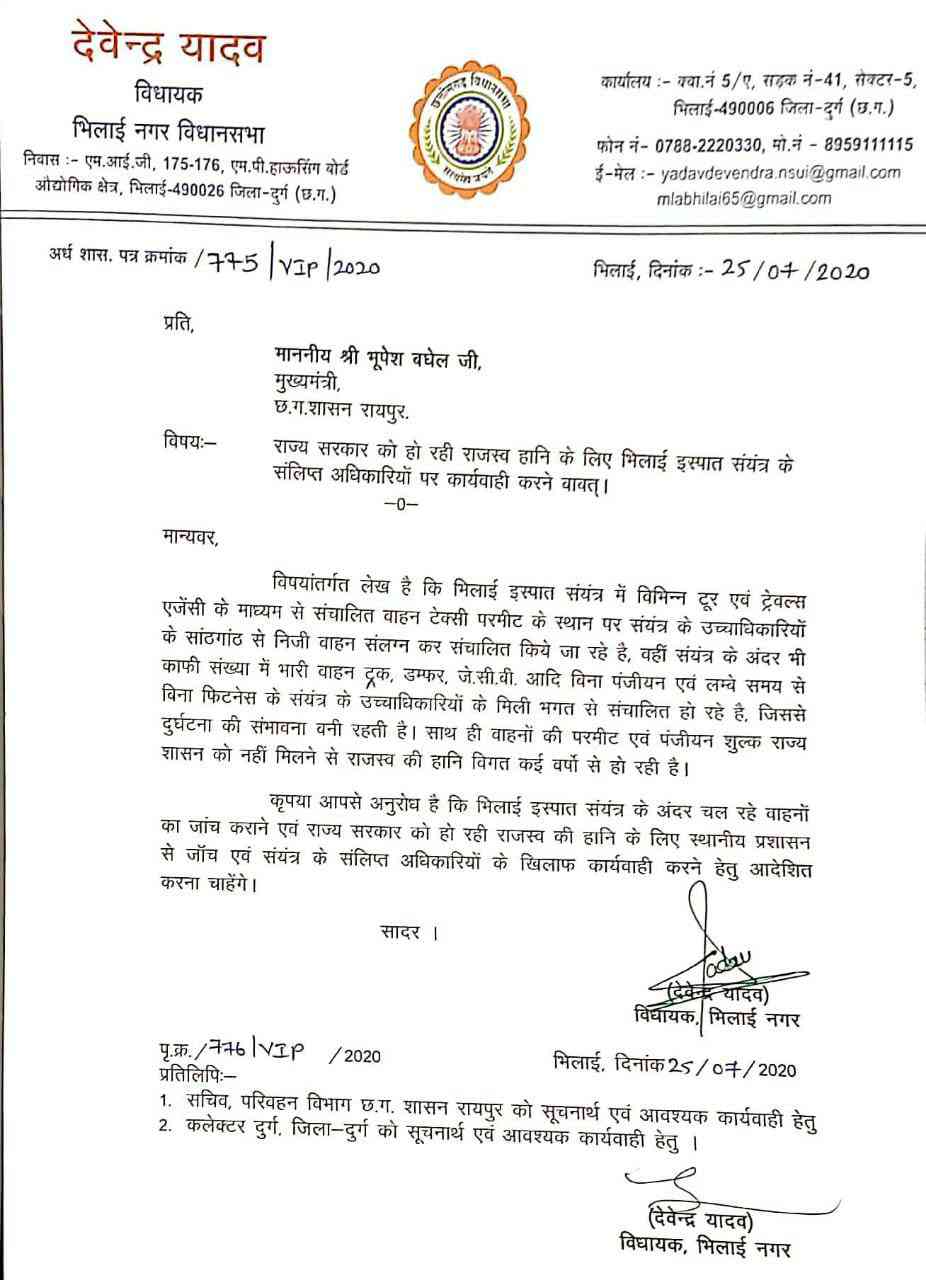 भिलाई।27/02/2020- भिलाई इस्पात संयत्र में अधिकारियों की सांठगांठ से नीजी वाहन व सैकड़ों कंडम वाहन चल रहे हैं। इनमें ट्रेवल एजेंसी द्वारा अधिकारियों की सेवा में लगाए गए वाहनों से लेकर भारी वाहन भी शामिल हैं। संयंत्र में ऐसे कई वाहन चल रहे हैं जिनकी न तो फिटनेस सही है और न ही वे मानकों पर खरे उतरते हैं। केवल अधिकारियों की मिलीभगत से इन वाहनों का संचालन हो रहा है। इस मामले में भिलाई नगर विधायक व महापौर देवेन्द्र यादव ने सीएम भूपेश बघेल को पत्र लिखकर ऐसे अधिकारियों व कड़ी कार्रवाई की मांग की है। मेयर देवेन्द्र यादव ने पत्र में लिखा है कि भिलाई इस्पात संयंत्र में विभिन्न टूर एवं ट्रेवल्स के माध्यम से संचालित वाहन टैक्सी परमिट के स्थान पर संयंत्र के उच्च अधिकारियोंं की सांठगांठ से नीजी वाहन संलग्र कर संचालित किए जा रहे हैं। वहीं संयंत्र के भीतर काफी संख्या में भारी वाहन ट्रक, डंफर, जेसीबी आदि बिना पंजीयन व फिटनेस के लंबे समय से अधिकारियों की मिलीभगत से संचालित हो रहे हैं। इससे संयंत्र के भीतर दुर्घटना की संभावना बनी रहती है। साथ ही वाहनों का परमिट व पंजीयन शुल्क राज्य सरकार को नहीं मिल पा रहा है। जिससे सरकार को वर्षों से राजस्व की हानि हो रही है। विधायक व महापौर देवेन्द्र यादव ने पत्र के माध्यम से सीएम भूपेश बघेल से कहा है कि भिलाई इस्पात संयंत्र में चल रहे वाहनों की जांच कराई जाए। राजस्व हानि को लेकर स्थानीय प्रशासन से जांच कराने के बाद संलिप्त अधिकारियों के खिलाफ कार्रवाई की मांग की है।