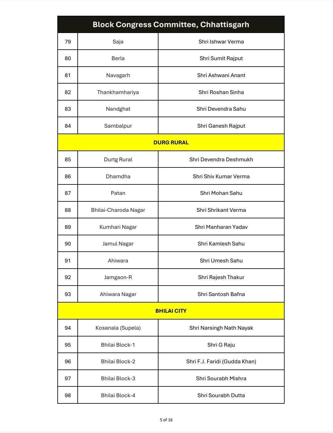 भिलाई जिले में कोसानाला (सुपेला) से नरसिंह नाथ, भिलाई ब्लॉक-1 से जी. राजू, भिलाई ब्लॉक-2 से एफ.जे. फ़रीदी (गुड्डा खान), भिलाई ब्लॉक-3 से सौरभ मिश्रा, भिलाई ब्लॉक-4 से सौरभ दत्ता तथा भिलाई ब्लॉक-5 से श्रीमती दानेश्वरी साहू को ब्लॉक अध्यक्ष की जिम्मेदारी सौंपी गई है।